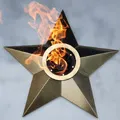 - Фигура звезды. Фигура изготовляется из листовой нержавеющей стали марки AISI 304, латуни, бронзы, меди. Толщина стенки листового материала не менее 3 миллиметров. Стандартная звезда вечного огня - это фигура пятиконечной формы, что вписывается по размеру в окружность диаметром около 1100 миллиметров. Высота фигуры звезды по центральной оси 140 миллиметров. По центру фигуры звезды находится полая выборка цилиндрической формы с установочным фланцем, предназначенная для удобного и безопасного монтажа ветроустойчивой газовой горелки